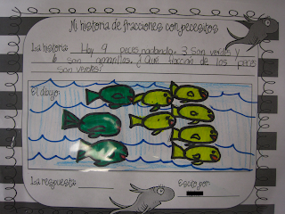 Enough of the mushy gushy now...and on to fractions. We are wrapping up our Fraction unit this week, and my kids have been working on solving fraction number stories. Today, I thought why not amp up the fun and write some of our own. And while we are at it, lets do a literature tie-in to Dr. Seuss...after all it is his month. Thus, I present you with "Our Fish Fraction Stories", inspired by Dr. Seuss' "1 Fish, 2 Fish, Red Fish, Blue Fish" (or in my class "Un pez, 2 peces, pez rojo, pez azul").