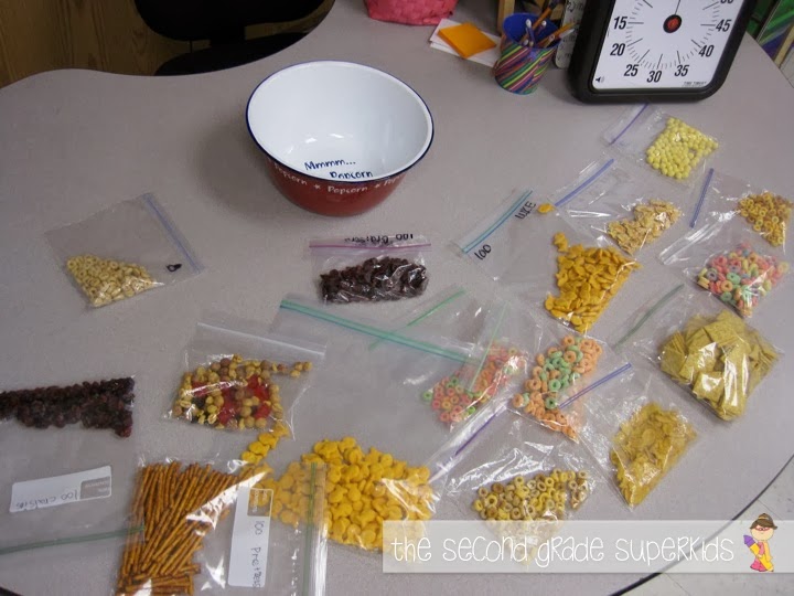 Another activity that my students seemed to truly enjoy each year was creating a 100th day trail mix for all to enjoy. I sent a note home to parents the night before asking them to count 100 small (and healthy) food items out with their children the night before and send them to school in a ziploc baggie to be added to our mix. We then worked together on our 100th day to count by 100's as we added all of the items to our giant bowl! Last year I had the students help me create an anchor chart as we counted titled "We can Count by 100's" and with each bag of goodies we added, I had a kiddo come up and add the next number to our list! With all they had brought, we were about to count to around 2,500, and it was great reinforcement of how to skip count this way!